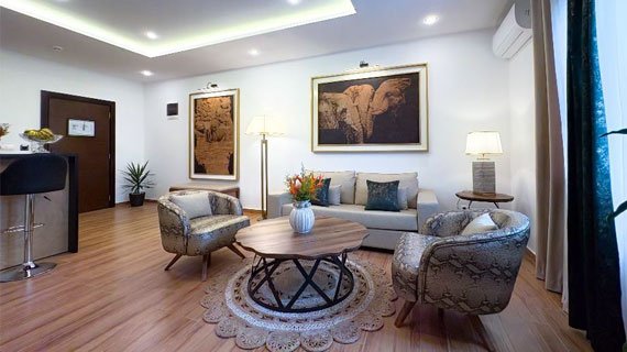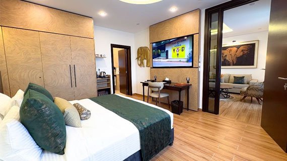Spacieuse et raffinée, la Suite de l’Hôtel Bantu offre un confort exceptionnel avec un salon privé, un grand espace nuit et une salle de bain double vasques.